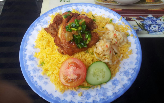 Quán cơm nằm tại số 71 Nguyễn Huệ được nhiều người biết đến nhờ món cơm gà xối mỡ thơm ngon đặc trưng. Món cơm tại đây chinh phục thực khách bởi hạt cơm dẻo mềm, nóng hổi cùng phần gà đậm vị, thấm đều gia vị. Bên cạnh đó, món ăn còn được phục vụ kèm rau dưa chua ngọt, nước tương và canh rong biển, tạo nên tổng thể hài hòa và hấp dẫn cho bữa ăn.