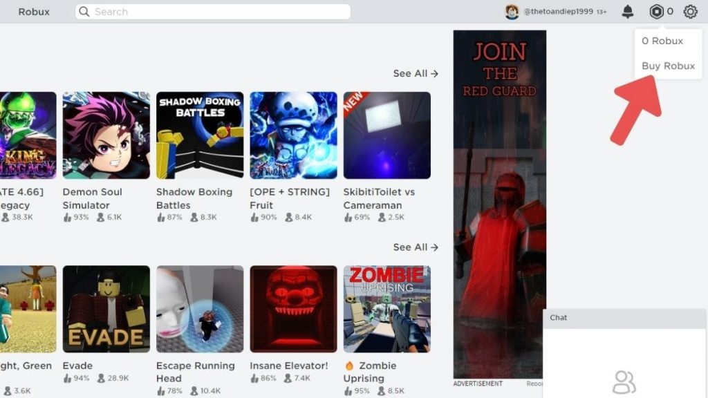 Bước 2: Ở góc trên bên phải, nhấp vào biểu tượng Robux (hình đồng xu) và chọn Buy Robux.