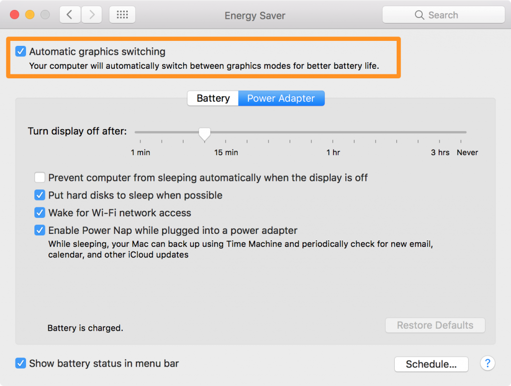 - Tắt Automatic Graphics Switching: System Preferences > Energy Saver > Bỏ chọn.