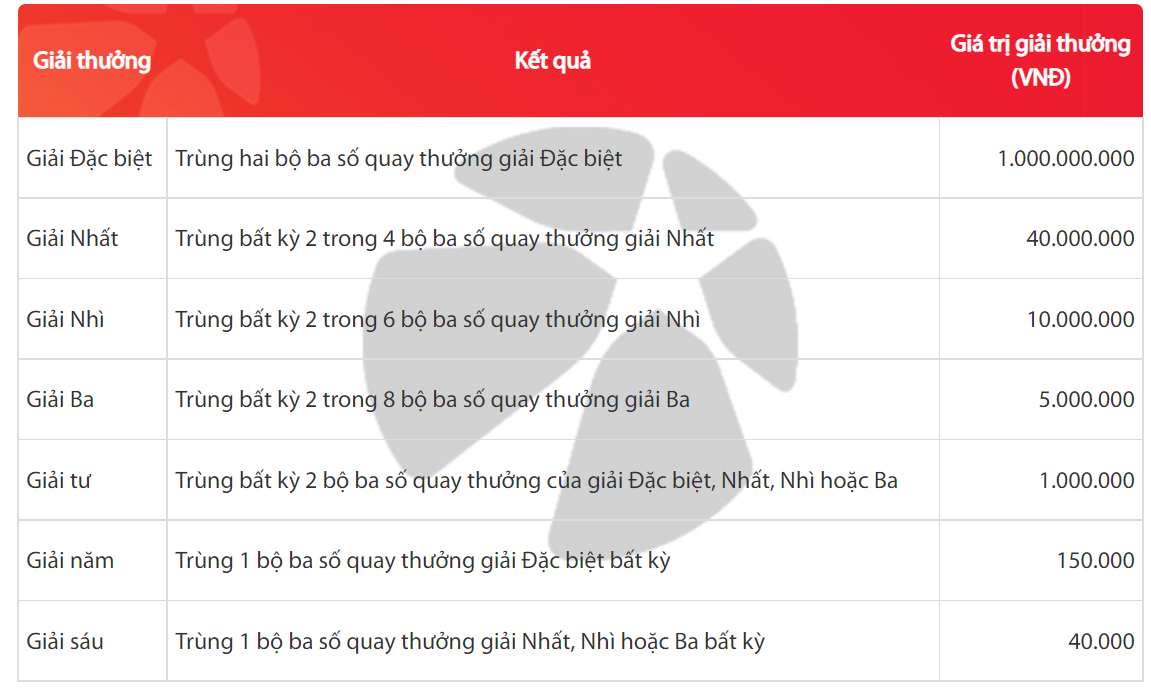 - Cơ cấu toàn giải thưởng trên áp dụng với vé dự thưởng gồm hai bộ ba số khác nhau. Trong trường hợp người tham gia chọn hai bộ ba số giống nhau thì giá trị giải thưởng nhận được sẽ cao gấp hai lần giá trị nêu ở bảng trên.
