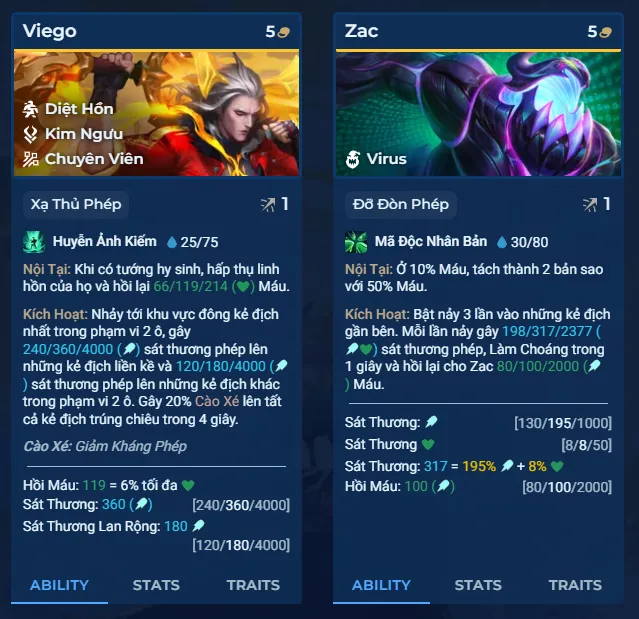 • Veigar (Chùm Giả Lập, Chuyên Viên): Nếu Veigar có cấp sao cao hơn đối thủ, hắn sẽ gây thêm sát thương chuẩn – một cơ chế ép người chơi phải nâng cấp sớm.