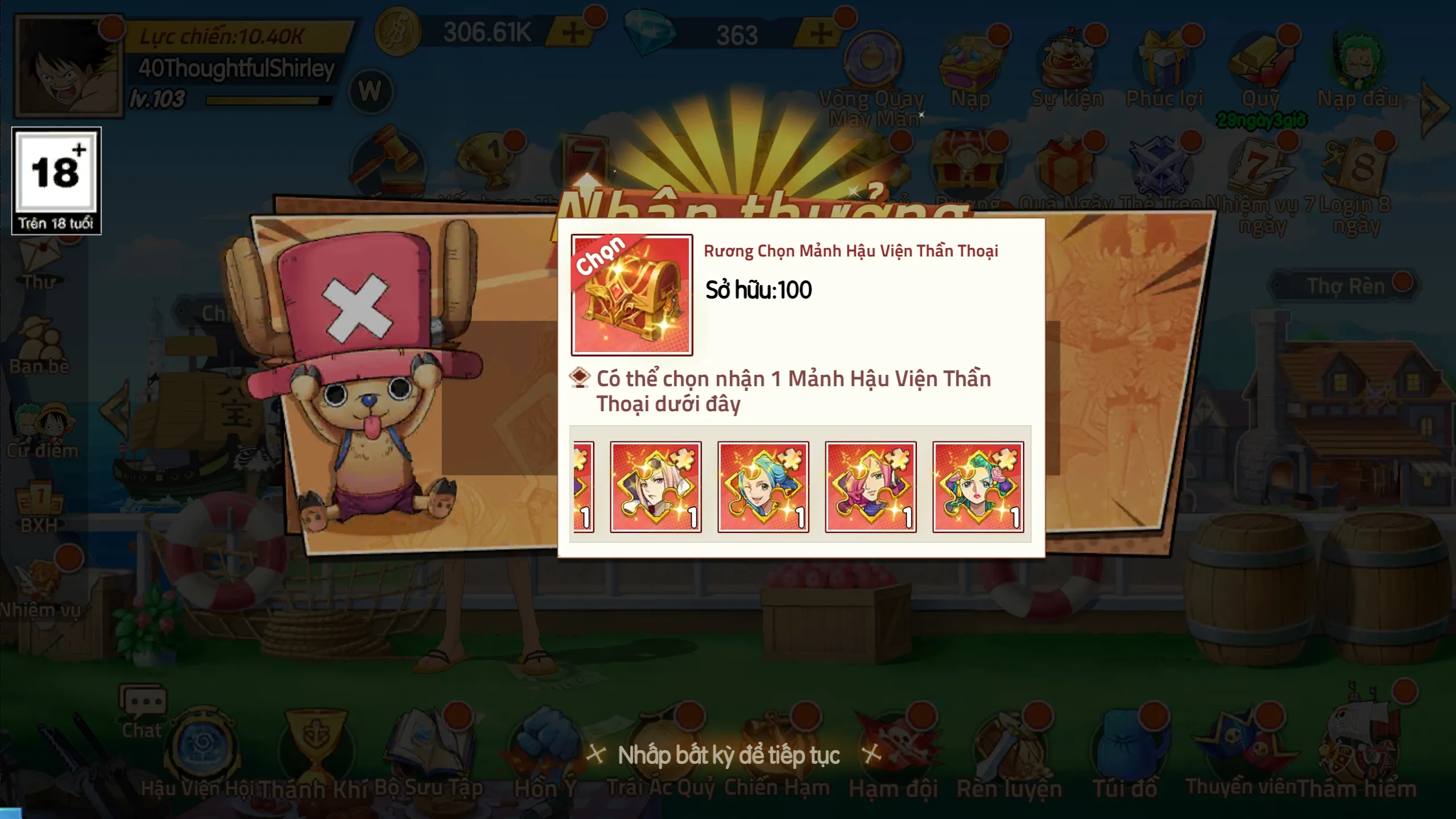 - Mốc 500.000 VNĐ: Nhận ngay Nghiệp Hỏa – Luffy, 2000 Kim Cương và Bù Nhìn 6 Sao.