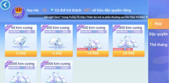 Bước 2: Khi giao diện nạp xuất hiện, bạn chỉ cần chọn gói kim cương phù hợp với nhu cầu để tiến hành mua.
