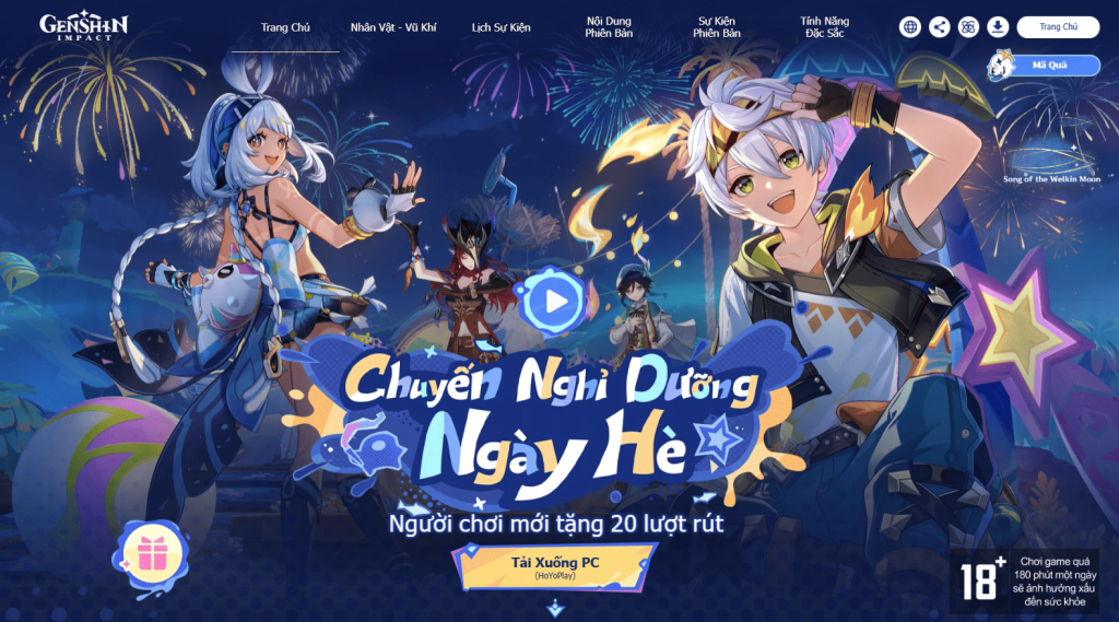 Mở trình duyệt và truy cập trang chủ Genshin Impact. Nhấn vào nút Tải Xuống PC (HoYoPlay) ở góc giữa phía dưới màn hình.