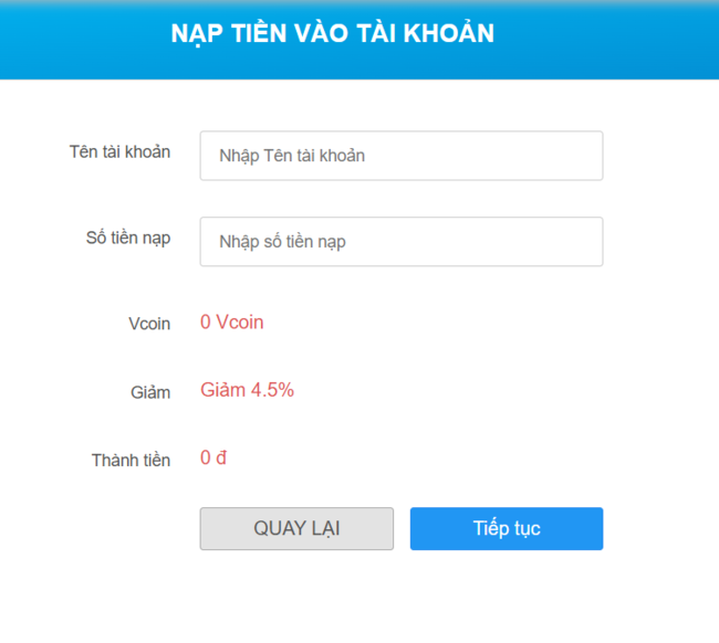 - Bước 3: Vào mục “nạp Game” và chọn “Nạp Vcoin”. Tại đây bạn sẽ điền các thông tin theo yêu cầu: Tên tài khoản, Số tiền nạp.
