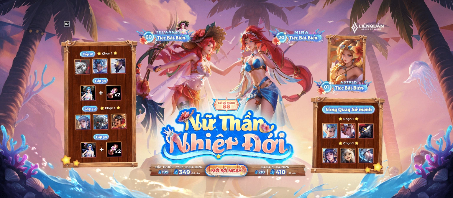 Hãy nhanh tay đặt trước ngay hôm nay để không bỏ lỡ bữa tiệc bãi biển sôi động cùng Tel’Annas, Mina và Astrid. Chúc các Kiện Tướng có những giây phút leo rank vui vẻ và sớm hoàn thành Sổ Sứ Mệnh 88!