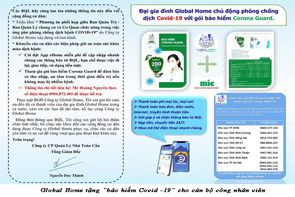 Song song đó với tinh thần toàn dân chống dịch và nhằm để nâng cao tinh thần quyết liệt mang đến chất lượng tốt nhất và sự hài lòng của Quý cư dân tại các chung cư do Global Home quản lý. Công ty Global Home với kiến nghị nhanh chóng của Ban quản trị các chung cư đã quyết định ký kết cùng Công ty bảo hiểm Quân đội (MIC) triển khai gói bảo hiểm Corona Guard dành tặng cho toàn bộ nhân viên, đồng thời có chính sách giá ưu đãi cho các thành viên gia đình của nhân viên có nhu cầu trong dịch bệnh Covid 19 với một chi phí ưu đãi và thời gian linh hoạt nhằm đảm bảo an toàn sức khỏe tốt nhất để phục vụ cư dân.