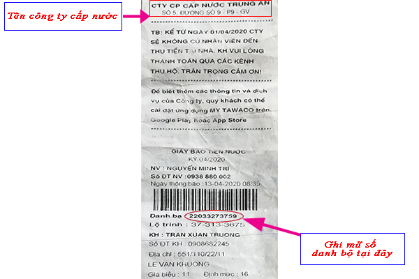 - Cách 2: Xem trên hóa đơn thanh toán tiền nước hàng tháng.