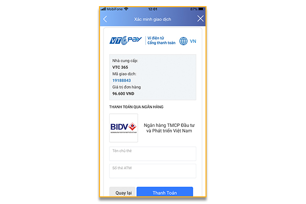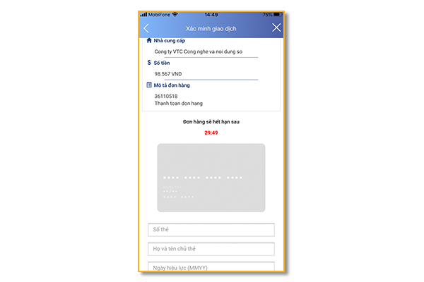 - Điền các thông tin có trên thẻ ATM để tiến hành mua thẻ: