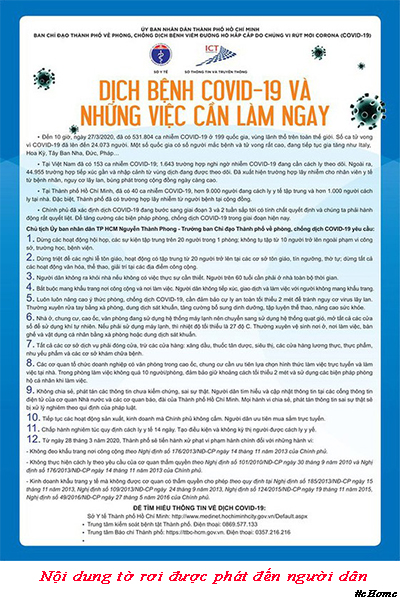 Trước diễn biến phức tạp và ngày càng lan rộng của dịch bệnh Covid-19, Sở Thông tin và Truyền thông TPHCM đang phát 5 triệu tờ rơi (từ ngày 27/03/2020) nêu rõ 12 việc cần làm ngay đến tận tay từng hộ gia đình trên địa bàn Thành phố nhằm huy động toàn TP chung tay tận dụng '14 ngày vàng' trong phòng chống dịch Covid-19.