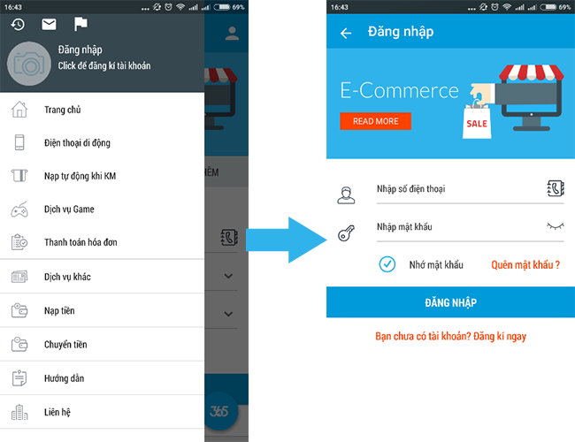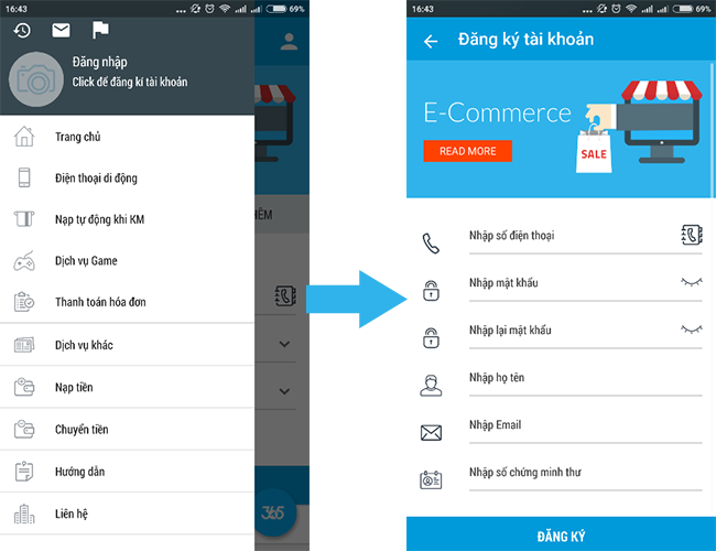 + Nếu bạn chưa có tài khoản, đăng ký và kích hoạt tài khoản ngay trên app, sau đó tiến hành đăng nhập.