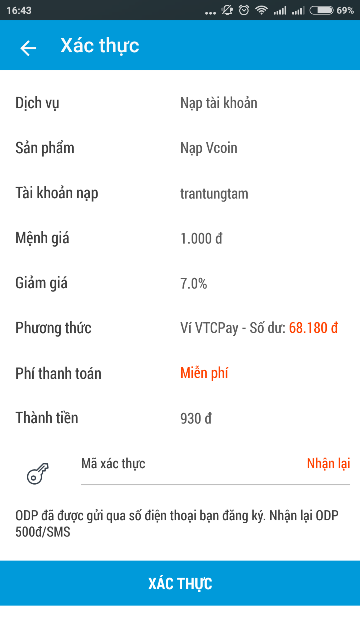 Mã xác thực ODP sẽ được gửi về điện thoại của bạn dưới dạng tin nhắn. Bạn chỉ cần nhập mã xác thực để hoàn thành giao dịch nạp Vcoin.