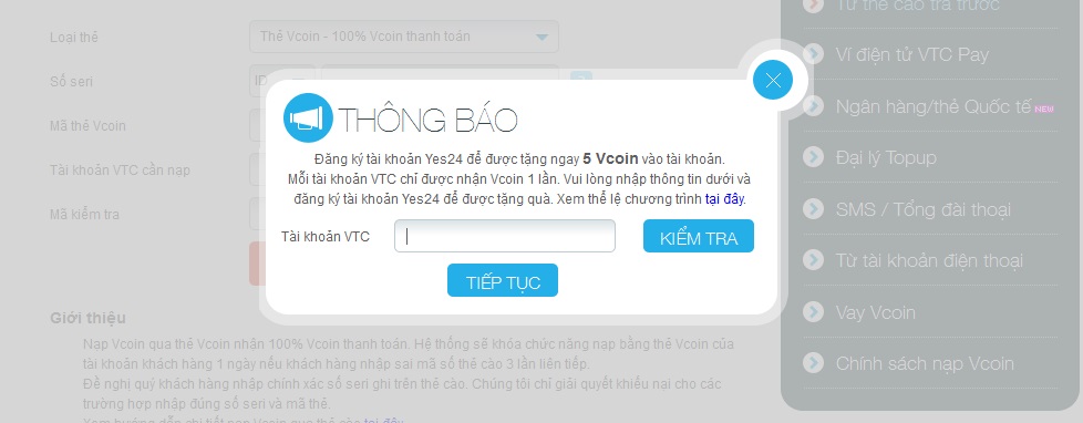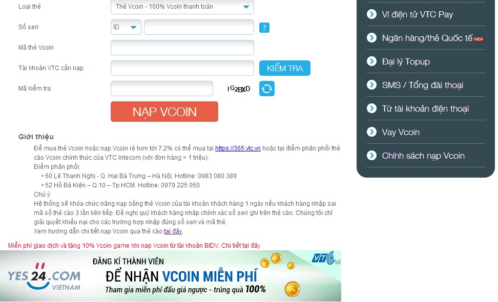 Yes24.thành công theo trình tự các bước hướng dẫn trên, bạn sẽ nhận được thông báo trên trang VTCid, số Vcoin thanh toán được cộng ngay vào tài khoản VTC