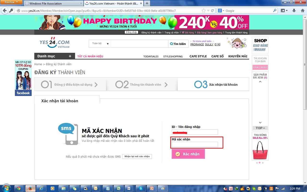 Bước 2: Trang sự kiện “ Đăng ký thành viên tại Yes24, nhận ngay Vcoin miễn phí"xuất hiện, bạn vui lòng nhập tên tài khoản VTC muốn nhận Vcoin