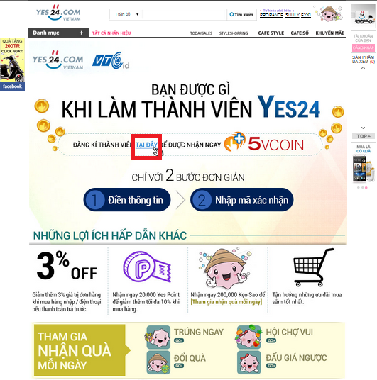 Bước 1: Bạn vui lòng vào trang Nạp Vcoin trên trang id, click vào banner “ Đăng ký thành viên tại Yes24, nhận ngay Vcoin miễn phí" .