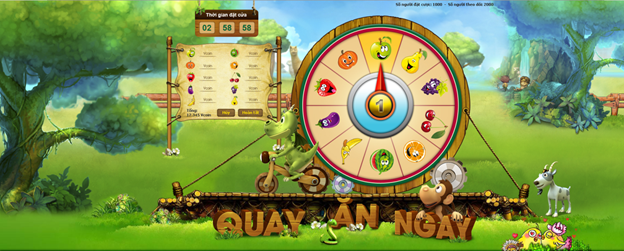 Vòng quay sẽ có 10 ô, mỗi ô là 1 nhân vật hoa quả vô cùng dễ thương như Chuối, Nho, Táo, Dâu Tây…Các bạn chỉ cần đặt 1 số lượng Vcoin vào loại hoa quả mình ưa thích, và chờ đợi kết quả sau mỗi phiên quay.
