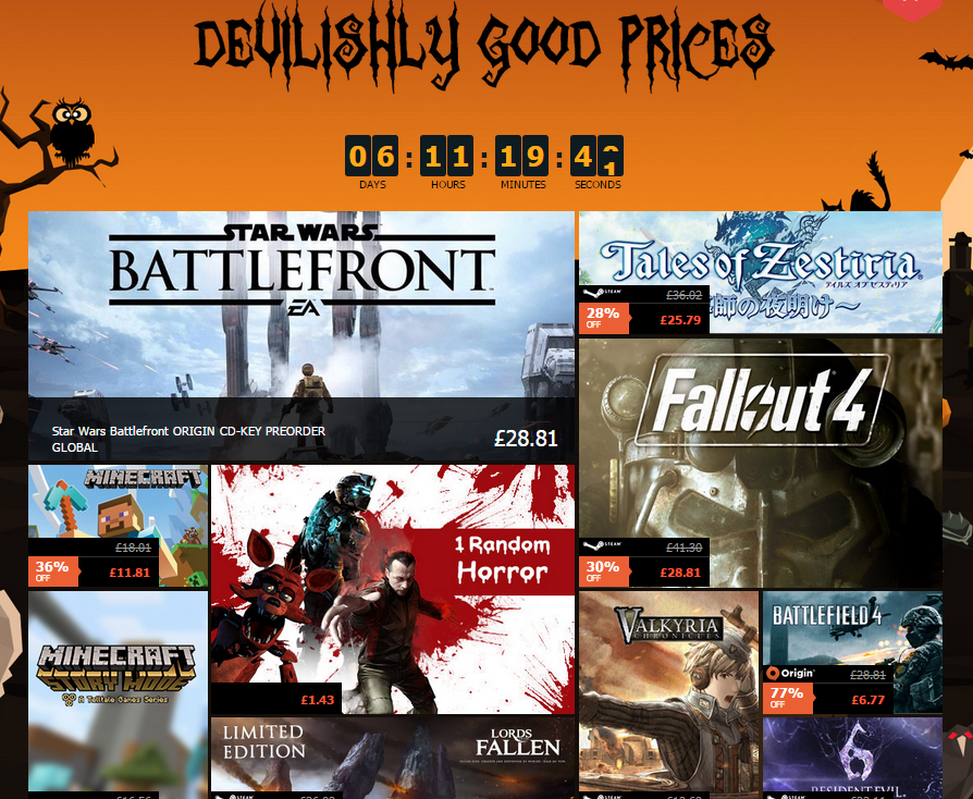 Từ A tới G về Cổng giao dịch game G2ATừ 28/10/2015 – 03/11/2015, tất cả các game thuộc thể loại kinh dị được giảm giá lên đến 83%, gần 1000 tựa game đình đám sẽ được bán với mức giá rất thấp. Không chỉ thế, các gamers Việt còn có cơ hội sở hữu ngay