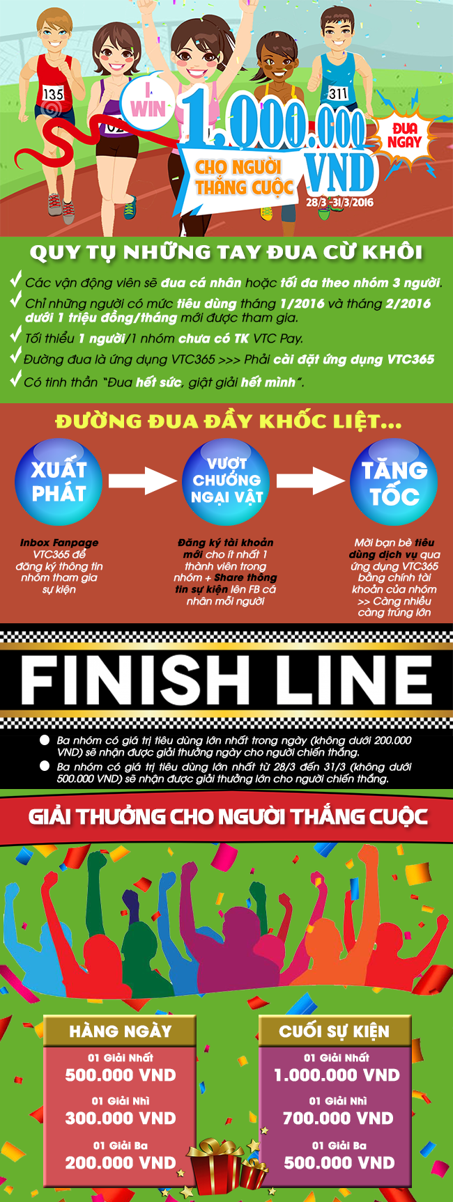 - Các giải thưởng nhất nhì ba mỗi ngày và cuối sự kiện sẽ trao trực tiếp vào tài khoản Ví điện tử VTC Pay của cá nhân/nhóm.