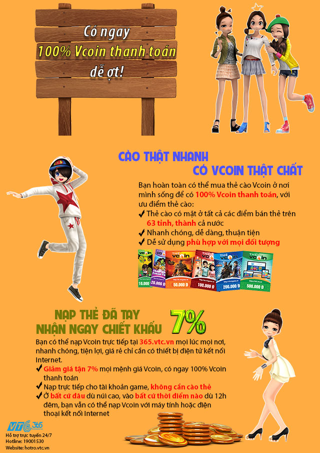 nạp Vcoin dễ dàng, nhận 100% Vcoin thanh toán, và thoải mái chơi game quên tháng ngày rồi.