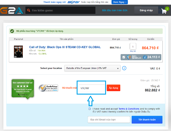 Một ưu đãi nữa dành riêng cho các gamers đã đọc bài viết này, đó là ngoài việc được giảm giá trực tiếp tại G2A.com, các gamers sẽ còn được giảm thêm 3% khi chọn thanh toán qua Cổng thanh toán VTC Pay và nhập mã VTCPAY khi thực hiện thanh toán đấy. Đã rẻ nay còn tiết kiệm hơn thật nhiều!!