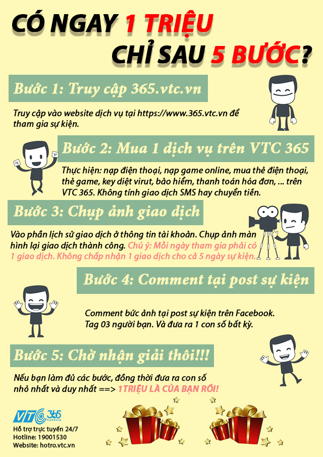 Bỗng một ngày có1 triệu đồng rơi vào đầu bạn, bạn sẽ làm gì? Mua sắm, đi ăn cùng bạn bè, tranh thủ mua quà cho gấu,….? Nhưng 1 triệu đồng đó ở đâu rơi xuống? Từ SỰ KIỆN CỰC HOT "COMMENT SỐ HAY - NHẬN NGAY 1 TRIỆU" do VTC 365 tổ chức dành cho tất cả các khách hàng thân thiết, được tổ chức từ 21/09 đến 25/09. Mỗi ngày sẽ có 1 giải thưởng 1 TRIỆU ĐỒNG dành cho người may mắn nhất, làm đúng yêu cầu và "sở hữu" con số NHỎ NHẤT và DUY NHẤT.