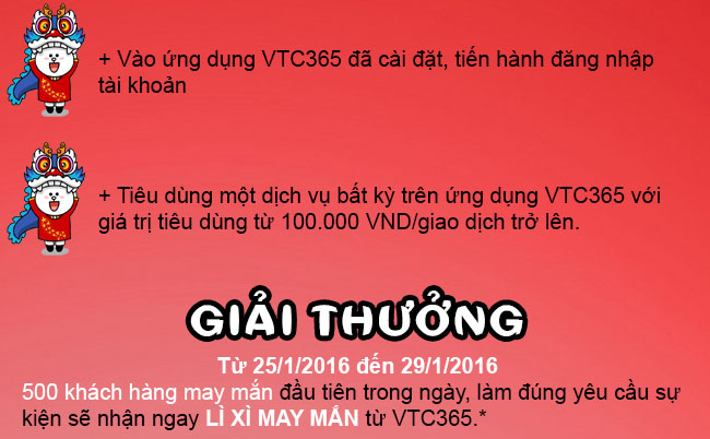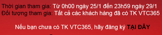 ự kiện sẽ diễn ra từ 25/1/2016 đến 29/1/2016, đòi hỏi các khách hàng củaVTC365 phải thật nhanh, thật vội, để bắt kịp với từng sự kiện và giành phần thưởng hấp dẫn từ VTC365.