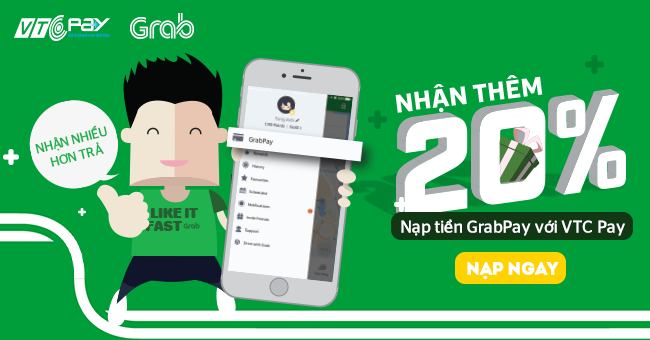 TẶNG THÊM 20% KHI NẠP GRABPAY VỚI VTC PAY từ hôm nay tới thứ 7 ngày