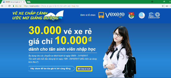 “Vé xe chắp cánh – Ước mơ giảng đường” là một chương trình hỗ trợ tân sinh viên trong năm học mới 2017. Chương trình được tổ chức bởi VeXeRe.com phối hợp cùng Trung ương Đoàn Thanh niên Cộng sản Hồ Chí Minh, Trung tâm Văn hóa, Giáo dục và Đào tạo UNESCO - CEP cùng các nhà xe trong cả nước để hỗ trợ 30.000 vé xe giá 10.000 đồng cho tân sinh viên nhập học.