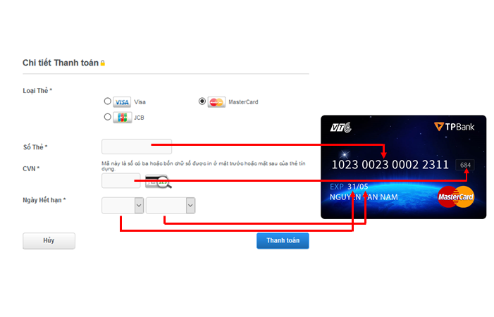 Nhập các thông tin trên thẻ theo hướng dẫn sau và ấn THANH TOÁN: