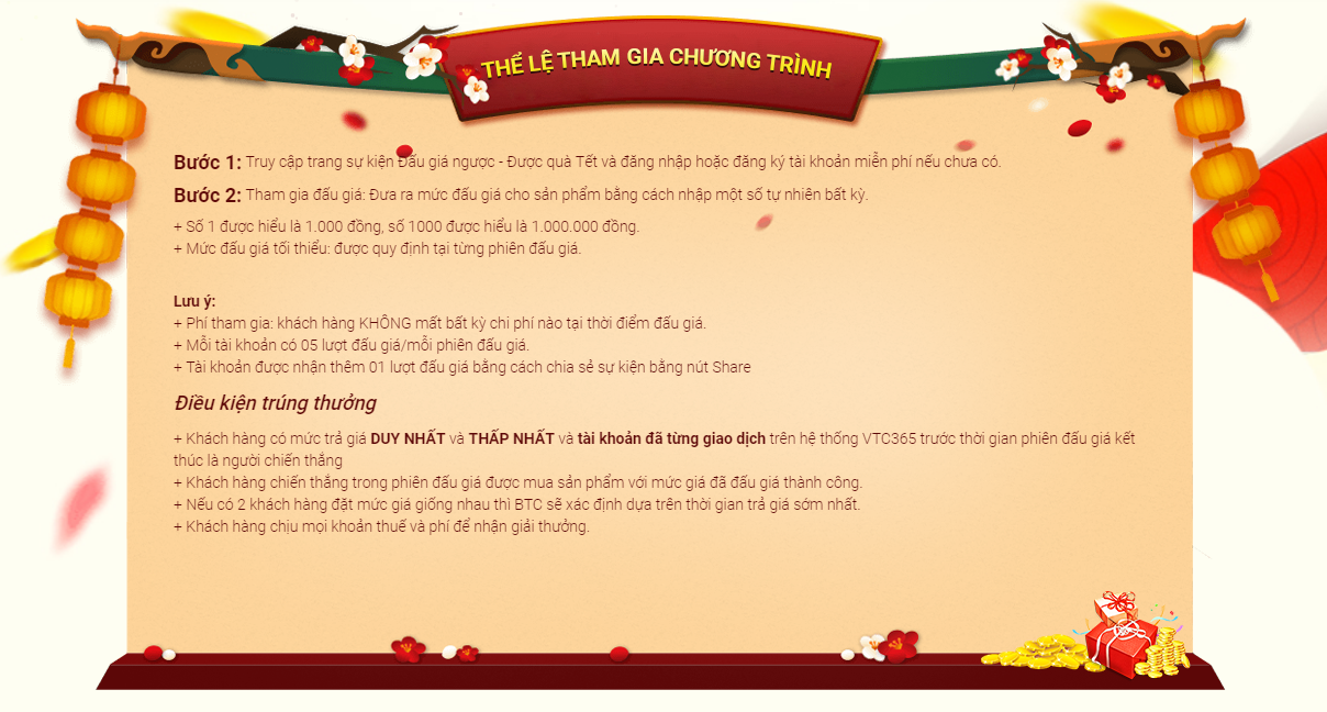 Cảm ơn tất cả các khách hàng đã đồng hành cùng VTC Pay, VTC365 và tham gia sự kiện "Đấu giá ngược - Được quà Tết". Mọi thắc mắc vui lòng liên hệ: