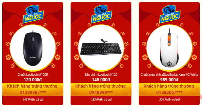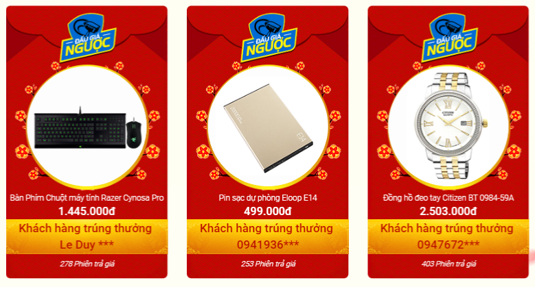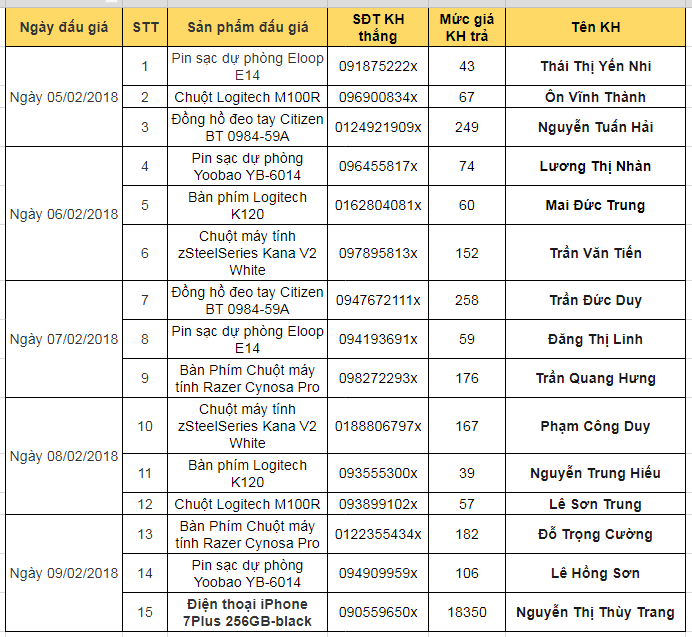 Sau mỗi phiên đấu giá, hệ thống tự động update Khách hàng may mắn thắng phiên đấu giá và có cơ hội được mua sản phẩm đấu giá với mức giá thấp nhất và duy nhất mà khách hàng đó trả. Danh sách được công bố lần lượt như sau: