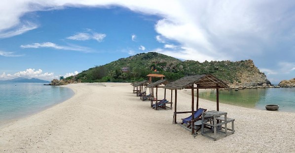 Một bờ cát trắng, hai bãi biển nước trong vắt 2 bên...