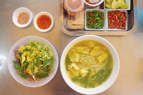 Nui: Bên cạnh hủ tiếu, bánh canh hay bún bò, nui cũng là món ngon được nhiều người ưa chuộng. Nui dẻo mềm ăn kèm với giò, huyết được bán tại một quán nằm bên trong khu chợ. Để tăng thêm độ đậm đà của món ăn, đầu bếp còn nấu kèm tôm khô, nước lèo ngọt và thơm mùi xương. Mỗi tô nui thịt có giá 25.000 đồng. Nếu thích ăn giò, bạn có thể gọi thêm, giá sẽ thay đổi tùy theo yêu cầu của khách.