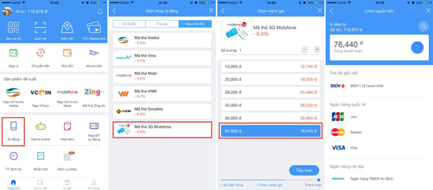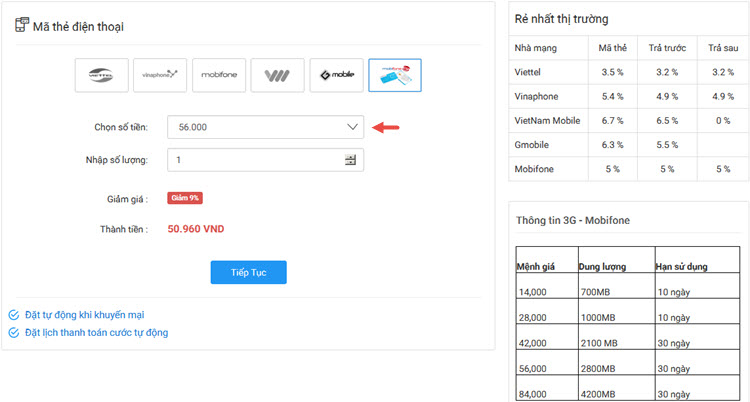 (Vào trang 365.vtcpay.vn – chọn “Mã thẻ điện thoại” – chọn “Mã thẻ 3G Mobifone)