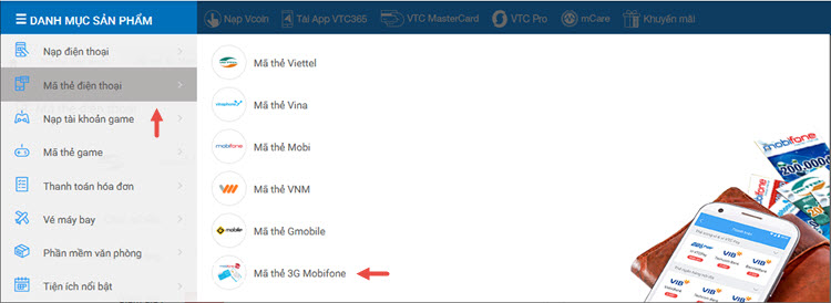 9% nhé!) bằng cách chọn Danh mục sản phẩm/Mã thẻ điện thoại/Mã thẻ 3G Mobifone như trong hình: