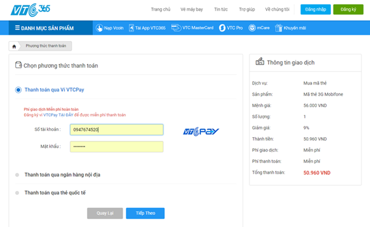 (Bạn lựa chọn thanh toán bằng tài khoản Ví điện tử VTC Pay, thẻ ngân hàng nội địa hoặc thẻ quốc tế, sau đó click “Tiếp tục” để hoàn thiện giao dịch)