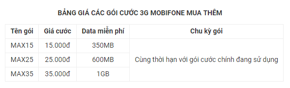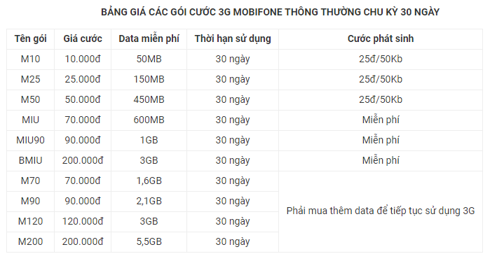 Các gói cước 3G Mobifone thông thường chu kỳ 30 ngày.