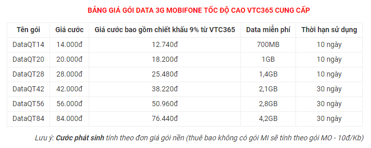 Các gói cước 3G Mobifone do VTC365 cung cấp.