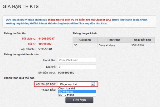 gia hạn thuê bao Truyền hình số vệ tinh VTC, khách hàng mua thẻ và thực hiện gia hạn dịch vụ khá phức tạp. Để tối ưu hóa phương thức gia hạn dịch vụ, VTC cung cấp thêm phương thức