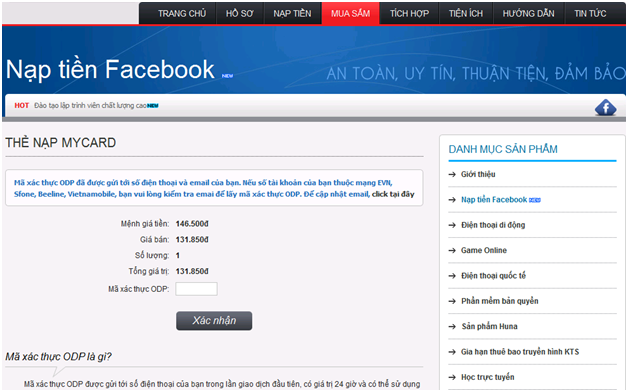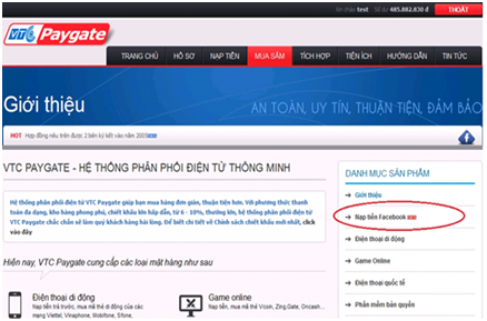 Bước 1: Truy cập VTC Paygate, có thể đăng nhập hoặc không đăng nhập, và vào chức năng Nạp tiền Facebook ở mục Mua sắm.
