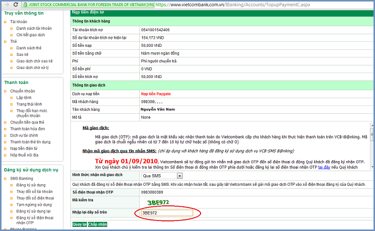 Quý khách kiểm tra lại thông tin tài khoản và thông tin lệnh nạp tiền vừa khởi tạo, nhập lại dãy số mã kiểm tra hiện trên màn hình để xác nhận thông tin giao dịch và chọn "chấp nhận"