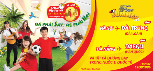 Tưng bừng đón hè, từ 9/5 đến 31/7/2018, Vietjet dành tặng chuỗi ưu đãi lớn nhất trong năm “Đá phải say – Hè phải bay” với hàng triệu vé siêu tiết kiệm giá chỉ từ 0 đồng vào khung giờ vàng 12h – 14h.