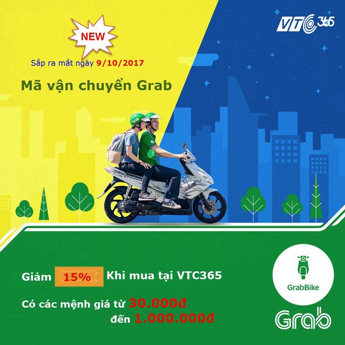 Ngày 9/10 tới đây, Mã vận chuyển Grab sẽ chính thức được bán tại hệ thống VTC365, cụ thể là trên website thương mại điện tử https://365.vtcpay.vn, phục vụ các khách hàng thường xuyên có nhu cầu di chuyển bằng GrabCar, GrabBike hay GrabExpress tại Hà Nội, TP Hồ Chí Minh và Đà Nẵng. Ưu đãi đặc biệt dành cho khách hàng, giảm 15% mỗi mệnh giá. Thêm mã giảm giá, thêm vui khi di chuyển cùng Grab nha các bạn!