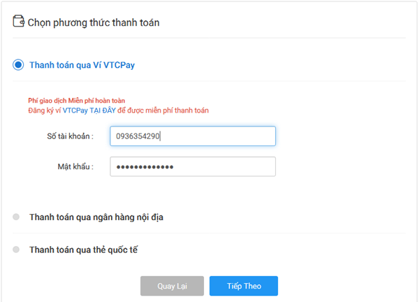 Bước 3: Chọn thanh toán qua Ví điện tử VTC Pay, qua Ngân hàng nội địa hoặc qua Thẻ quốc tế. Sau vài giây hệ thống sẽ gửi tin nhắn mã bảo mật OTP. Bạn nhập mã bảo mật và kết thúc giao dịch