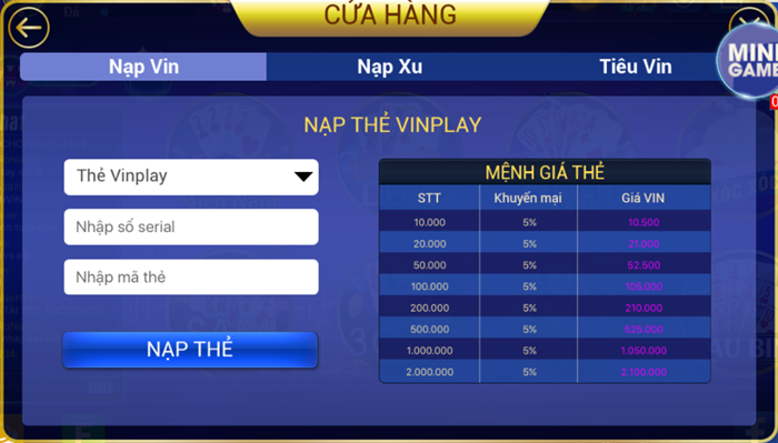 http://vinplay.com), đây là loại thẻ có mức chiết khấu cao nhất cho khách hàng. Nạp tiền bằng Vinplay Card bạn sẽ luôn được khuyến mãi 5% giá trị thẻ nạp.