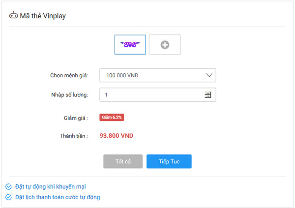 Khi mua mã thẻ Vinplay tại VTC365 hoặc App VTC Pay, bạn sẽ nhận được mức giá giảm là 6,2%