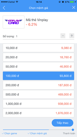 Bước 2: Chọn số lượng và mệnh giá thẻ Vinplay muốn mua