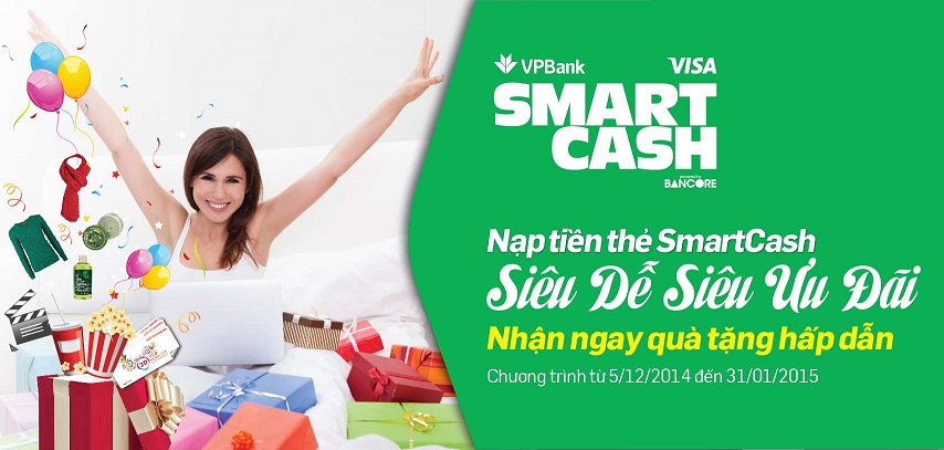 Từ ngày 5/12/2014 đến 31/1/2015, khi nạp tiền, mua Voucher thẻ Visa trả trước SmartCash bạn sẽ nhận được phần thưởng hấp dẫn. Ước tính chương trình có tổng số hơn 4 nghìn quà tặng từ nhiều nhãn hàng nổi tiếng.