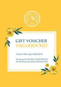 THE FACE SHOP Tặng ngay 100.000đ cho hóa đơn từ 500.000đ Điều kiện áp dụng: - Có giá trị đến ngày 30/06/2018 - Áp dụng cho hóa đơn từ 500.000đ tại hệ thống cửa hàng TheFaceShop. - Vui lòng trình phiếu quà tặng trước khi thanh toán và chỉ áp dụng 01 phiếu cho 01 lần thanh toán. - Không chấp nhận phiếu bị nhàu nát hoặc quá hạn sử dụng. - Không quy đổi thành tiền hoặc hoàn lại tiền thừa. - Không áp dụng cùng các ưu đãi khác. - Mọi thắc mắc vui lòng liên hệ: 028.3829 3105 Ext: 667 |