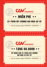 CGV CINEMAS Miễn phí 01 phần My Combo khi mua 02 vé Điều kiện áp dụng: - Thời hạn sử dụng từ ngày 01/06/2018 - 30/06/2018 - Coupon có giá trị quy đổi thành một phần My Combo (01 bắp vừa và 01 nước lớn). - Coupon chỉ được sử dụng 01 lần, không thể quy đổi thành tiền mặt hoặc mua bán. - Vui lòng đính kèm Coupon với 02 vé xem phim để nhận 01 My Combo miễn phí. - Không áp dụng đồng thời với các chương trình khuyến mãi khác tại CGV. - Coupon có giá trị tại tất cả rạp CGV trên toàn quốc. Tặng 50.000đ áp dụng cho 01 phần CGV Combo khi mua vé bất kỳ. Điều kiện áp dụng: - Thời hạn sử dụng từ ngày 01/06/2018 - 30/06/2018 - Coupon có giá trị 50.000đ áp dụng cho một phần CGV Combo (01 bắp lớn và 02 nước lớn). - Coupon chỉ được sử dụng 01 lần, không thể quy đổi thành tiền mặt hoặc mua bán. - Vui lòng đính kèm Coupon với vé xem phim để nhận ưu đãi khi mua 01 CGV Combo. - Không áp dụng cho Movie Combo. - Không áp dụng đồng thời với các chương trình khuyến mãi khác tại CGV. - Coupon có giá trị tại tất cả rạp CGV trên toàn quốc. |